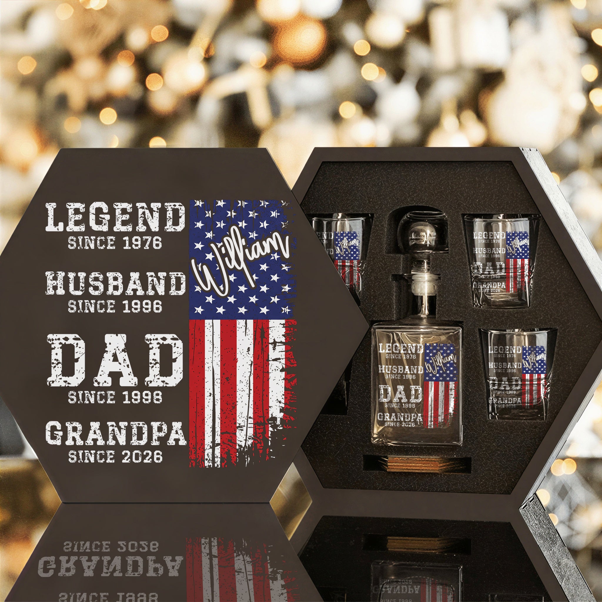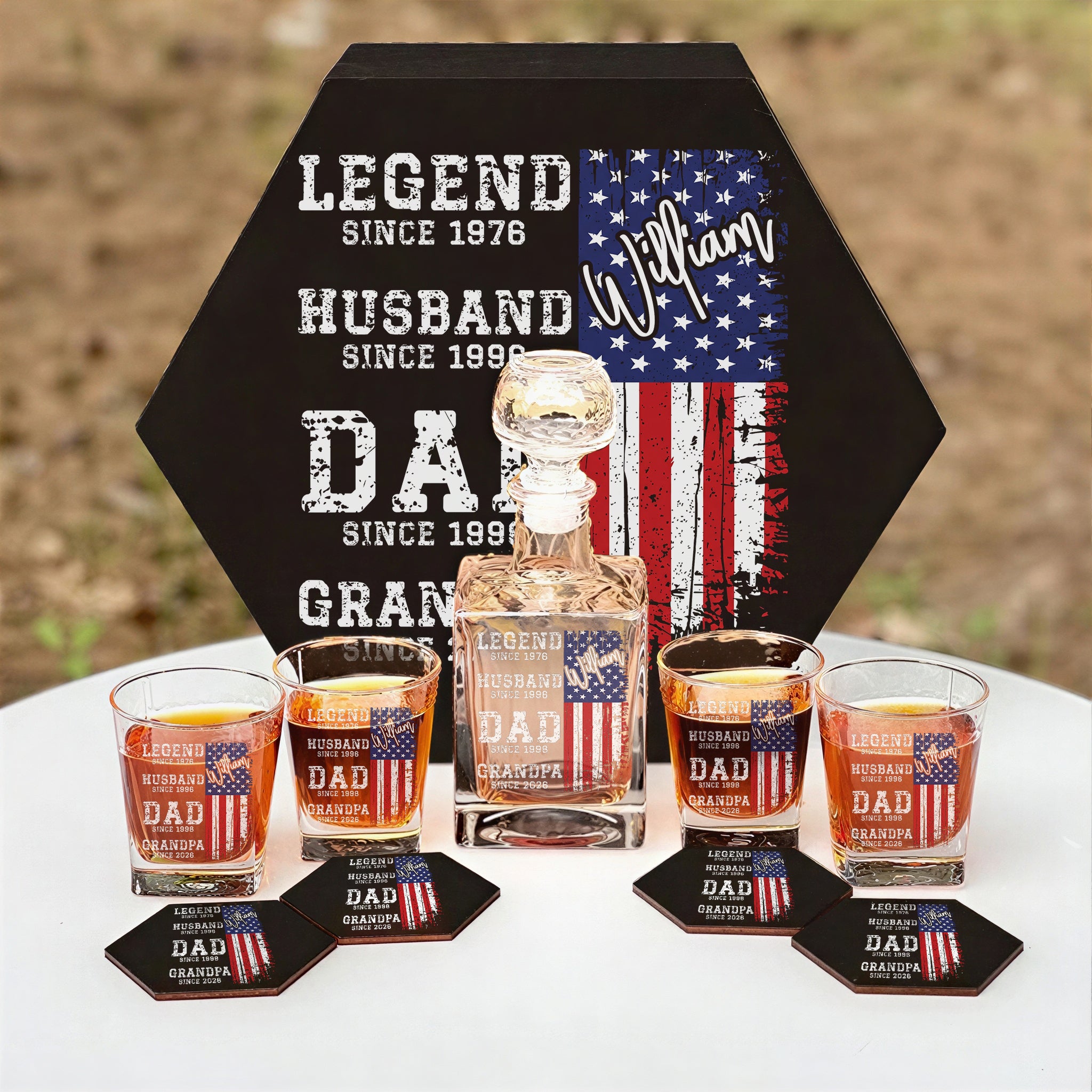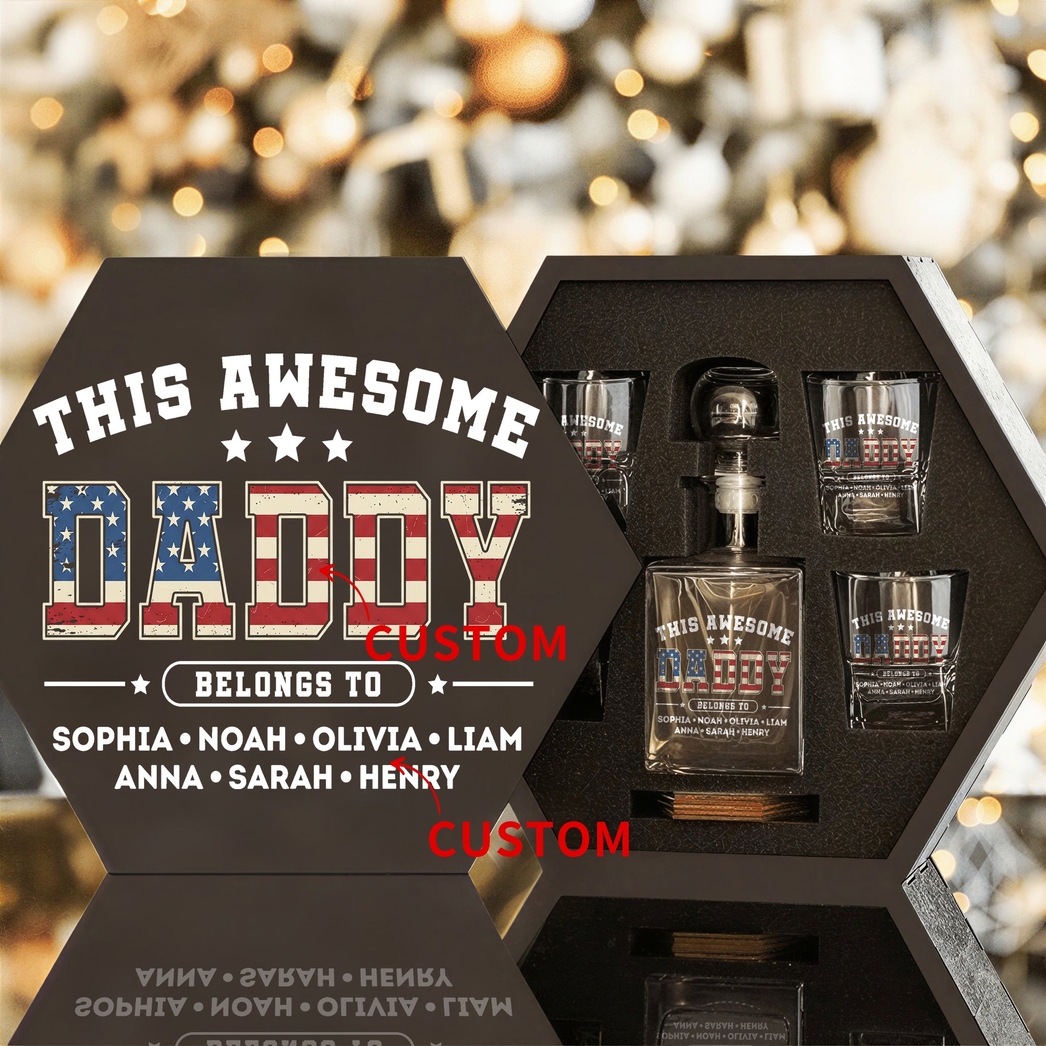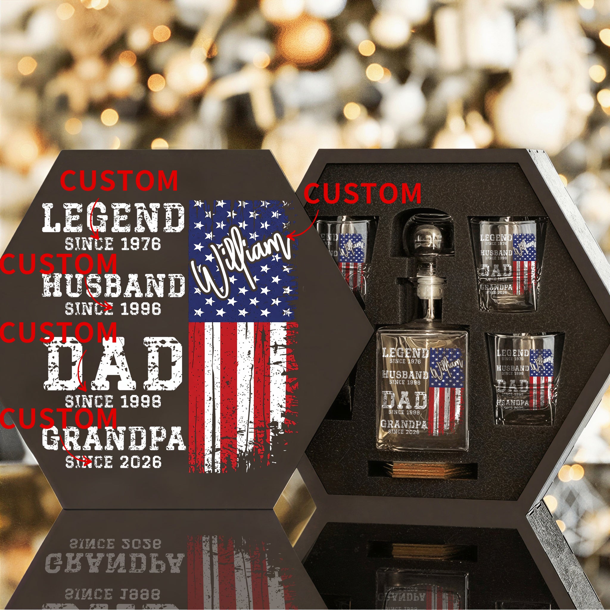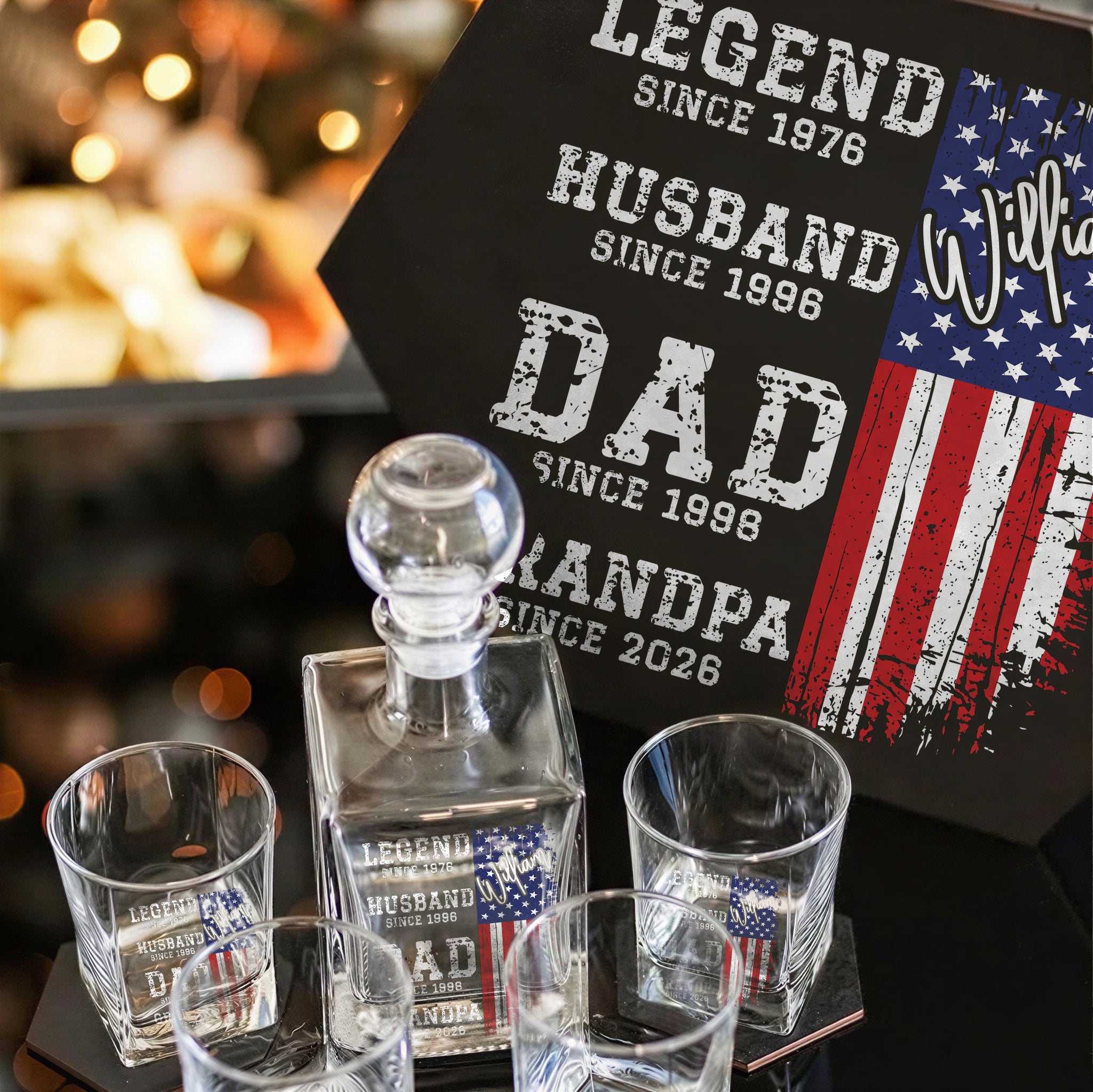 CUSTOM NAME - WHISKEY SET (Wooden box + Decanter + 4 Glasses + 4 Coasters), BOURBON WHISKEY, FATHER'S DAY GIFT, FOR WHISKEY LOVERS