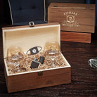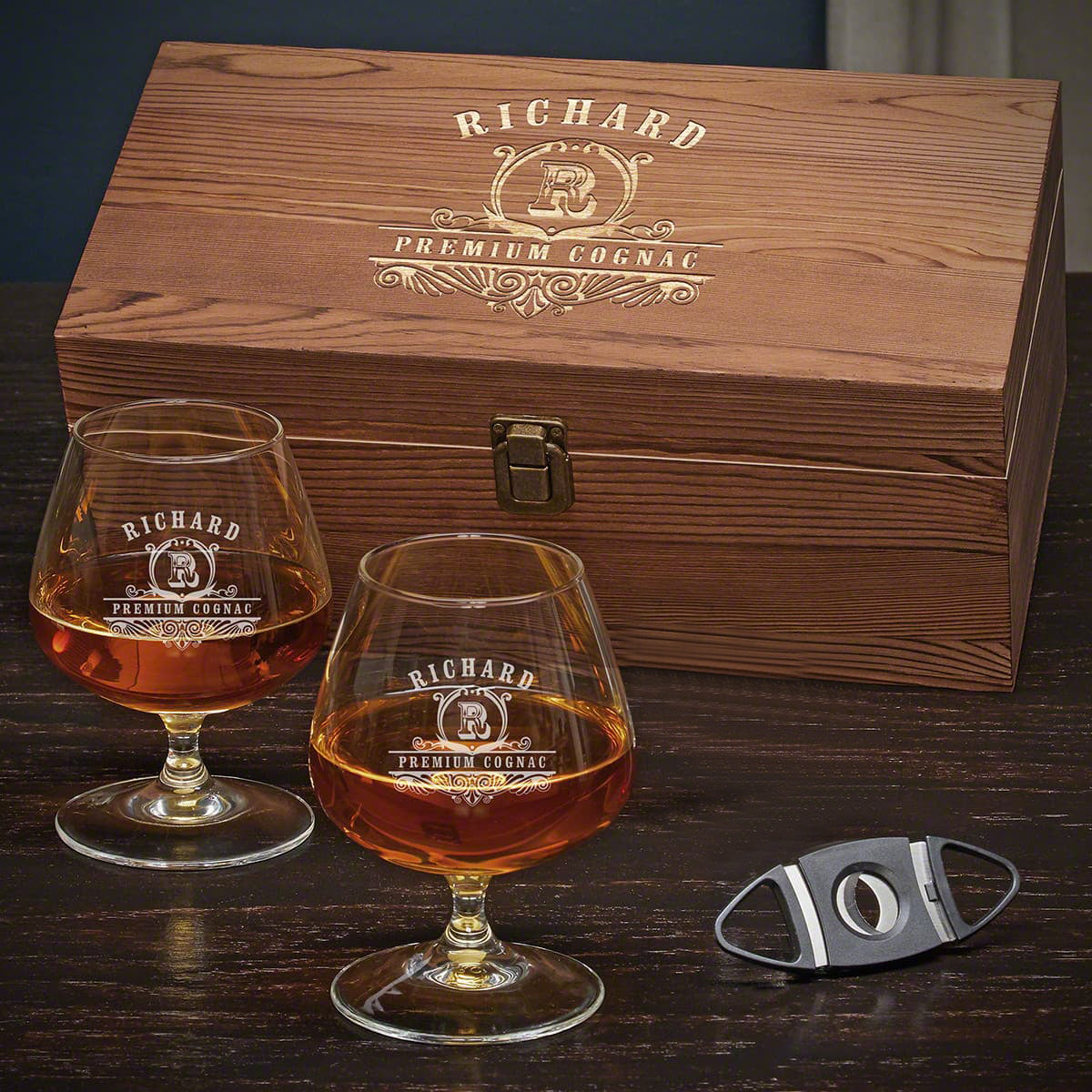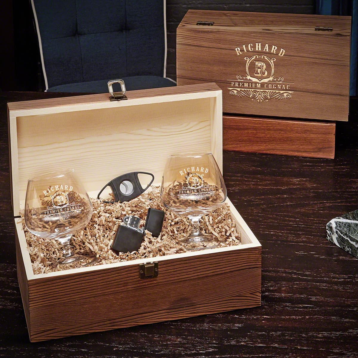 All-inclusive set for enjoying cognac and cigars. Phenomenal gift for the cognac guy in your life. Box and glasses can be customized with the selected design.