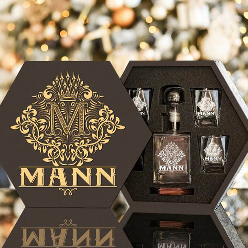 MANN - WHISKEY SET (Wooden box + Decanter + 4 Glasses + 4 Coasters)