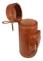 The travel humidor is a firm, leather wrapped cylinder measuring 8 inches from top to bottom and 3 1/8 inches in diameter.