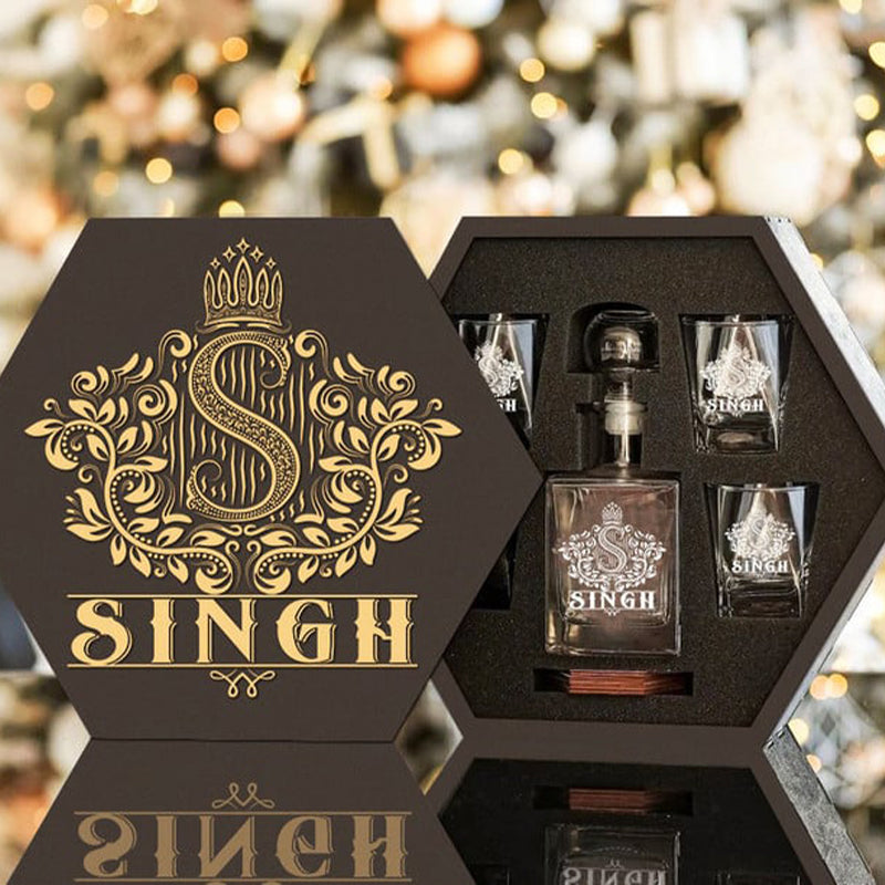 SINGH - WHISKEY SET (Wooden box + Decanter + 4 Glasses + 4 Coasters)