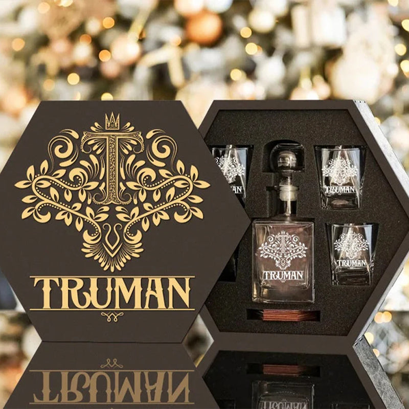 Whiskey Decanter Set is a Wonderful Gift Completely Personalized to Your Wishes to Your Loved Ones. The personalization of each element will remain in the memory as an exclusive gift, which is approached with special attention and the recipient receives an unforgettable emotion. This Personalized Whiskey Gift Set is a one of a kind gift, perfect and suitable for any occasion. Whiskey Decanter Set is a unique and thoughtful gift for loved one, brother, dad, colleague, boss, boyfriend or groomsmen. Perfect for Wedding Day, Birthday, Father Day, Corporate Gift, Christmas as well as for no reason